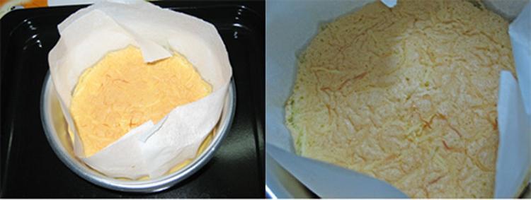 要更细并均匀。但,不知道是蛋液没有发好的原因,糕体不怎么发得起来,只有六寸模的三分之二,同事说不够第一次的香,里面比较实,没有第一次的那么松软。是不是应该把时间加长?我这次用了25分钟,上次的是30分钟。
