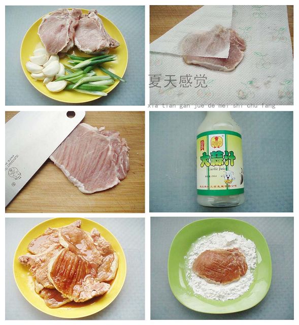 1 葱切段肉排用厨房纸吸干水份,用刀背拍松,加入盐,糖 ,胡椒粉,料酒,蒜汁,生抽腌20分钟 2 裹上生粉静置一会,炒锅放油烧7成热,把排骨炸成金黄捞出 3 锅留底油烧4成热,加蒜瓣青葱炒香,加肉排少许生抽和糖,水,一起烧5分钟即可