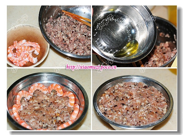 材料,冬菇焯过水,虾焯熟去壳,冬菇和肉剁碎
