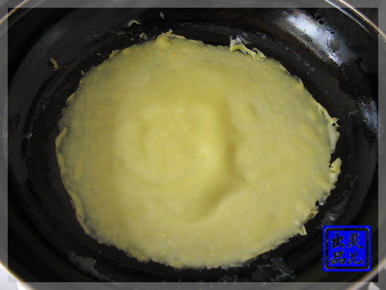 步骤三:平底锅内刷上一层食油,舀入一勺面糊,小火摊开成一张饼皮。