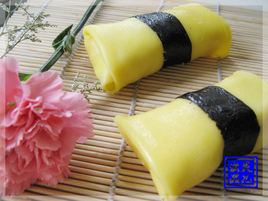 步骤四:饼皮平铺,放入适量的忌廉和芒果条。 步骤五:先把两边折合,再卷起成型,最后在中间捆上一条紫菜条即成。 ![]() 页码:[1] [2] [3] [4] 第3页、共4页
