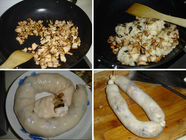 灌到猪肠里,不要灌太满,因为糯米吸水会膨胀