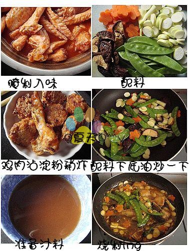3)鸡肉沾淀粉微炸两面金黄备用~ 4)锅里放底油,爆香蒜蓉,把配料炒一下,拿出备用~ 5)汤汁:高汤(我用鸡粉加水),鱼露,酱油,糖,拌匀 6)锅里爆香蒜蓉和姜丝,放入汤汁煮开后加入鸡拌匀,稍煮后就配料一起收汁即可