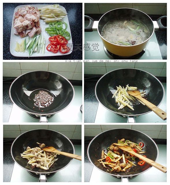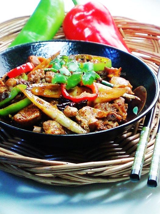 ,加鸡块炒匀,最后加辣椒圈,盐,酱油,鸡精炒匀