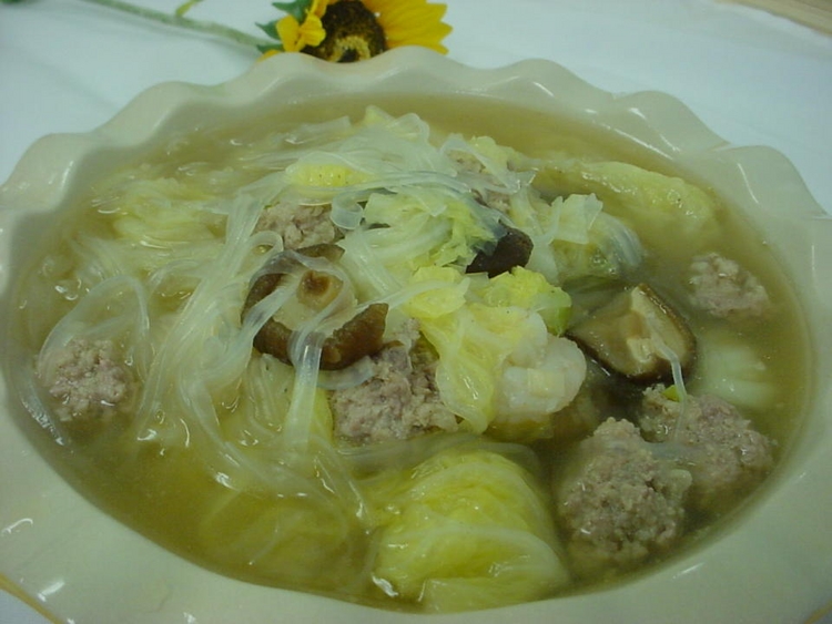 我喜欢清淡口味的菜,每次烧菜时盘里放少许盐,以下照片是我烧菜时手忙脚乱摄下来的.白菜粉条肉圆汤f1ay4l