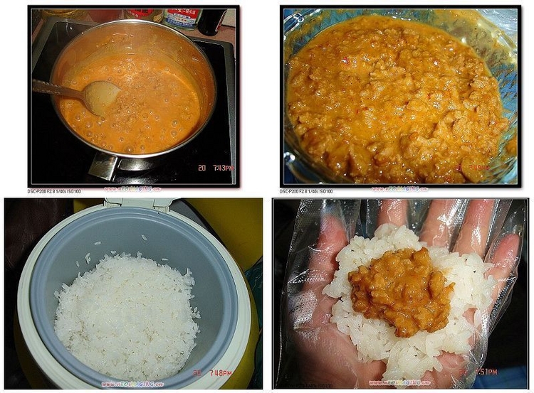 其实饭团是由我们中国古时创造出来的,不过中国的美食实在太多,后来流传到日本,日本的小鬼子可以拿得出手的东西实在不多,于是只好将从中国流传过来的饭团加以研制,不想这个在我们博大精深的美食文化中豪不起眼的小东西,竟在日本得以发扬~~~ 1,材料:肉沫,咖喱粉,花椒粉,胡椒粉,香油,粘米,糯米, 作法:A.肉沫腌好,按自己的口味腌制,然后煮熟备用。(我用了咖喱粉加花椒去腌制,出来的效果和我想像中的一样棒~~) B.煮好米饭,水放少一点. C.手上沾点水,将米饭包起肉沫,再放到做饭团的模子里(我在吉之岛买的,压得饭团好结实) 我因为赶着吃,就随便弄了个小人脸,不够可爱,下次有经验了,做多一些更可爱的