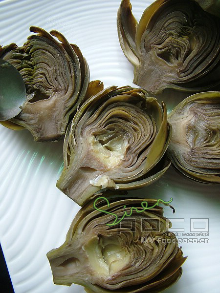 洋蓟在开水中煮半小时左右,切半,挖掉里面毛茸茸的部分