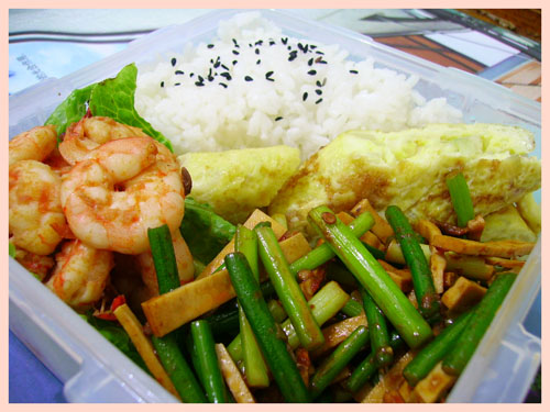 爱心盒饭78:豆瓣虾仁+蒜薹炒豆干+洋葱厚蛋烧