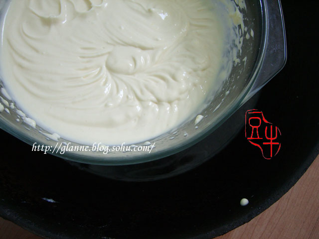 打发奶酪:建议先烧一锅温水,把奶酪隔水搅打这样效果好些,在打发过程中加入白糖和鸡蛋,一至两少果汁,打至能感觉奶酪开始粘稠即可;