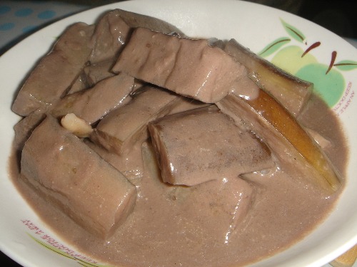 材料:茄子、蒜、虾酱、油 制法: 1、茄子切条后放入温暖的淡盐水中浸泡。 2、烧热油锅后爆香蒜头,放入茄子炒软后放水煮开。之后放入虾酱翻炒即可。