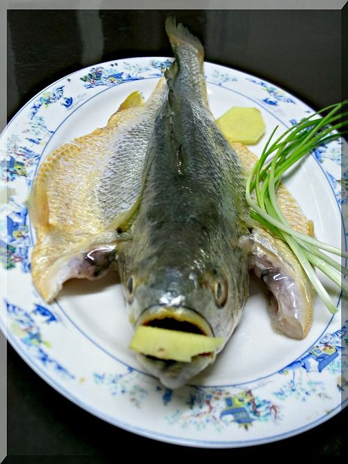 想来想去,灌汤是做不了啦,偶也不会做,咱就就做开片黄鱼吧。开片在无锡话中是小青头打架的专用词,俺的开片,就是把鱼给开片了!哈哈哈 鱼开好片,一定要在鱼的全身抹上点盐,把鱼腌渍一下,时间嘛起码半小时以上。腌好后,上蒸锅前,在鱼的身下放上点姜块和葱结。黄鱼嘴里我也让它衔上一块去皮的老姜。蒸的时候,姜味顺着鱼嘴往下窜,去腥效果好的很。鱼头最腥了啊!当然在上锅前,别忘了在鱼身上还要浇点料酒。