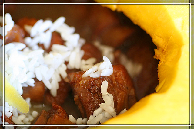 做法很简单,一句话:把烧到5成熟的排骨和浸泡过夜的糯米放入挖空的南瓜里,上锅蒸。