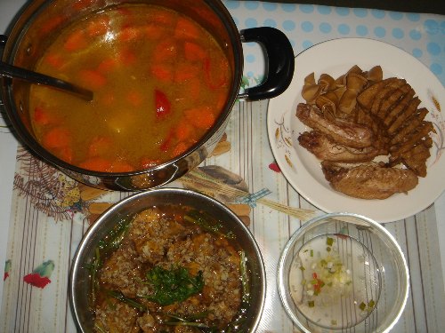 自从J去了珠海拼搏后,每个他回来的周末通常都会有特别的住家菜侍侯。这周有新菜哦,第一次做的咖哩煲!还有蘸醋吃的卤水杂锦,还有我喜欢吃的沙姜蒸鸡肝。