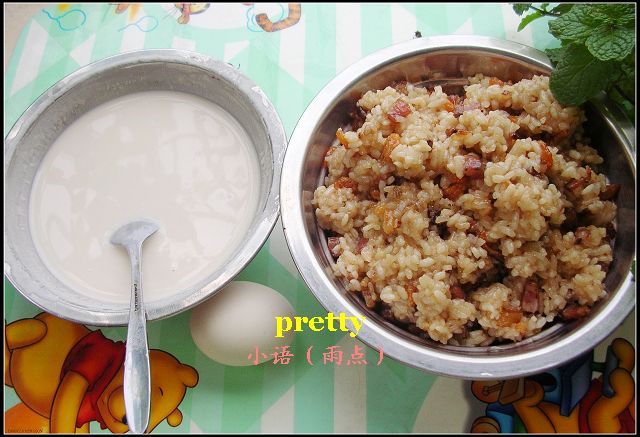 其实方法有点模仿盒子的做法。 材料:面粉、鸡蛋、糯米、腊肉、腊肠、虾米 做法: 1。面粉加上适量的水搅匀。腊肉、腊肠切粒和虾米糯米一起炒熟,做法以前我发过。 2。电饼档先涂油预热倒入面粉糊煎熟,再加入鸡蛋摊开在煎饼上,再加入已煎好的糯 米饭在上面,盖上盖,按煎饼的模式,等指示灯亮后就OK了,然后切开上碟,很香口很好 吃的呢。