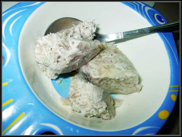 作法:1,先将大芋头削皮,切块蒸熟(我顺便蒸了几根腊肠),然后压碎