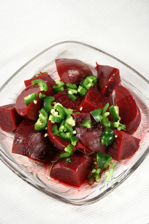 做法:红甜菜煮熟,放入盐糖,米醋,辣椒拌匀即可。