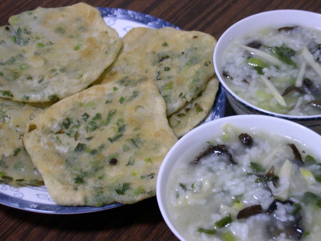 LG说想吃得清淡点,想到家里还有些剩饭,决定烧个菜泡饭。青菜、黑木耳、竹笋切丝,竹笋先加入和泡饭一起烧, 等烧开后,加入青菜和黑木耳继续煮至沸腾,加盐和蘑菇精香油调味。顺手做了几张葱油饼,好久没吃了,很香。做法很简单:先和面,不能太干,有点粘手就可以了,加入盐和蘑菇精一起搅匀;另外再取些面粉和色拉油调成油酥。案板和擀面杖上都抹些油。把面团分成小份,用擀面杖擀开后,在中间涂上油酥撒上葱花;把四周的面皮捏起来成团,再用擀面杖擀成薄饼,放入油锅中页码:[1] [2] [3] [4] [5] 第1页、共5页