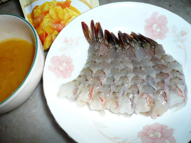 材料:大虾,蛋黄,生粉,李锦记香橙鱼块酱