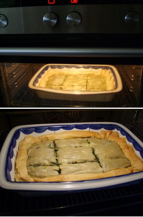再依次铺三层派皮,同样每层间涂橄榄油,还有最上面的派皮。最后把盘外多余的派皮卷起塞入盘中。
