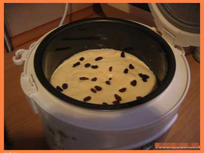 6、在电饭煲里涂一层油,如果不是不粘锅可以铺上一层油纸或者铝箔纸。在锅底放些核桃仁、瓜子仁之类的干果将蛋糕糊倒入电饭煲中。 7、将电饭煲按至煮饭加热档,约5分钟左右就跳到保温了,等过了2-3分钟后,再按一次煮饭加热,几分钟后又跳了(期间待面糊稍有硬度时可以在上面撒些葡萄干),这样反复3-4次,就可以闻到一股蛋糕的香味了。 8打开盖子,表面是浅*的,比原来长高了,用筷子戳一下,如果戳得进去,并且筷子没有粘蛋浆,就表示熟了。