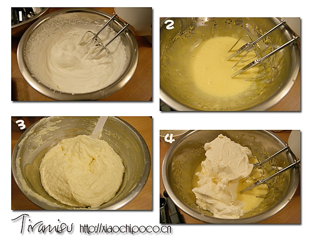 Mascarpone cheese 500克,鲜奶油 250毫升,鸡蛋 4只, 鱼胶粉 2大匙(14克), 水 80ml, 糖 100克, 浓缩咖啡(espresso) 100ml, Rum酒 5小匙,手指饼(lady finger)适量 做法 1 鱼胶粉洒在水上静置3分钟后,放热水上坐融 2 打发鲜奶油,备用