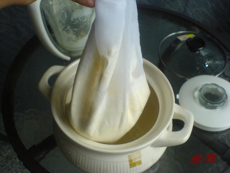 2.取一纱布袋(我用的是商场卖的褒汤隔渣袋)把1中的豆浆水倒入袋中,隔出豆渣
