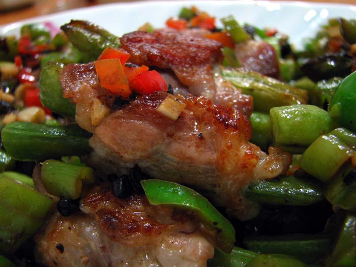 肉片用酱油腌一下,卷住用油盐水煮过的四季豆,下锅煎黄,上盘,淋豆豉青红椒粒糖盐水淀粉勾的芡.即可.