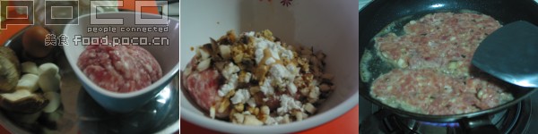 以前做的肉饼都是蒸出来的,煎肉饼还真是头一次,而且中间的步骤有些还错过了,只好临场发挥喽 材料:肉馅3元,马蹄5颗,香菇3朵,姜末 调料:生粉,生抽,鸡粉; 马蹄,香菇切碎,姜切末放进肉馅,依次加入生抽,生粉,鸡粉,顺时针方向搅匀(如果不同的方向搅,肉比较散) 调味后将肉饼压成块,锅里加油,油热后放肉饼两面煎.
