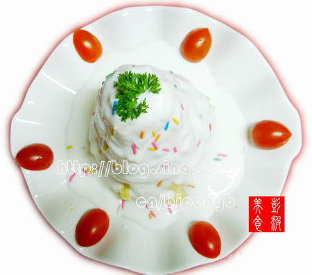 原料不用说,亲爱的 土豆 调料更简单,一杯酸奶,两勺卡夫奇妙酱,在来少点点盐,几片柠檬的汁,喜欢甜的加点炼乳,不喜欢就不要 做起来虽然有点费事,但要保证口感就无所谓了,先把有毒的土豆皮削去,然后发挥你那特别的刀功切片,上锅蒸上不用管了,10来分钟后看看,要是够烂拿出来打成泥,加上卡夫奇妙酱和点点盐,在来点鲜的柠檬的汁搅拌均匀,摆好造型,倒上酸奶,稍加点缀,一道造型美观,营养丰富,还有多重效果的地下苹果穿婚纱就告竣工! 最后说说冒充婚纱的酸奶,可以缓解牛奶不适症,抗菌整肠、维持肠道菌群平衡,降低胆固醇和血氨,改善便秘,增强免疫机能,对肿瘤细胞的生长有抑制作用!最重要的是美白滋润肌肤!