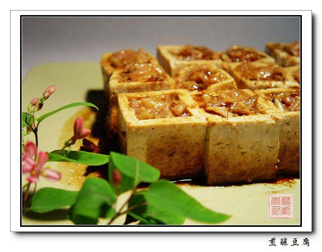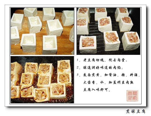 据说这个菜是客家菜,但我不这样认为,豆腐酿肉,哪个地方没有呢?有的是切成三角形,当中开口塞肉,叫荷包豆腐,这做好的荷包豆腐裹上蛋液煎一煎再烧,就是虎皮豆腐,豆腐先炸再酿肉,就是油豆腐塞肉,形式不同,内容一样。