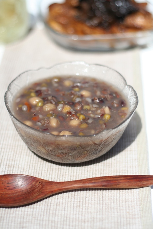 鹰嘴豆,黑豆,红糙米,糯米一起煮90分钟即可.