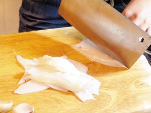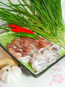 1、洗鱿鱼窍门:先在鱿鱼的眼睛上各切一刀,去掉眼睛后洗净,烹调时鱿鱼片就不会发黑难看;鱿鱼的眼睛里有种棕黑色的液体,洗的时候最好在水中清洗,以免这种液体四处飞溅。 2、鱿鱼的切法:先从左角开始切,刀和鱿鱼呈45度的角,切那种连皮不要断刀的斜线就可以了,然后换反方向再从右角切交叉的斜线,最后再切成长方型的小块。 3、鱿鱼营养价值很高,脂肪含量极低,对怕胖的MM来说,吃鱿鱼是一种好的选择。 ![]() ![]() 韭菜鲜鱿1