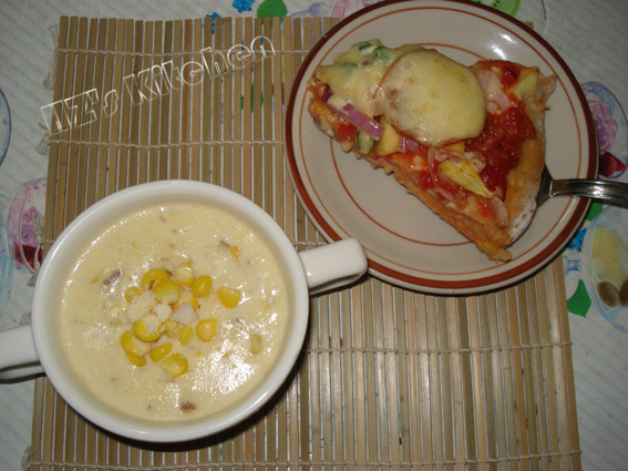 玉米奶油鸡茸浓汤和PIZZA