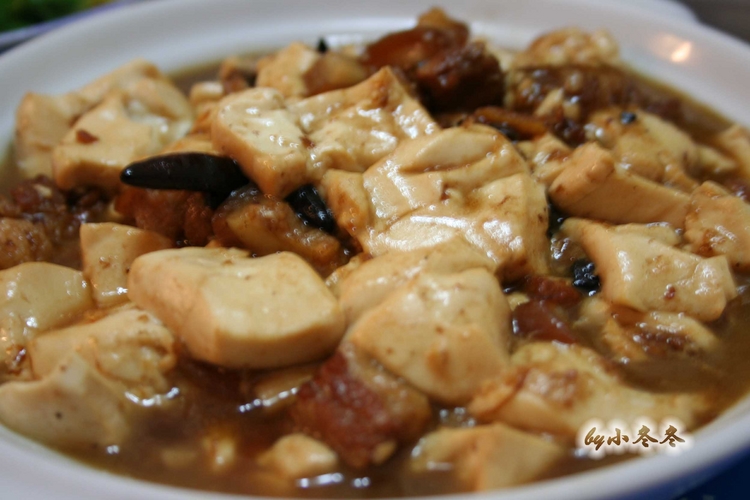 2、卤肉连汤汁一起放入锅中加热,根据汤汁的多少可加入少许开水,调味后加入豆腐一起焖十分钟即可