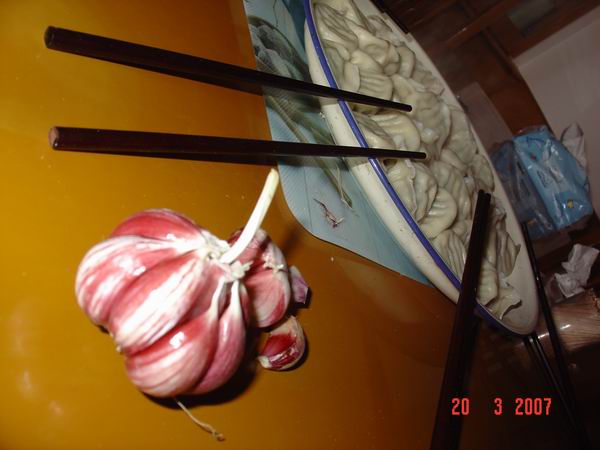 山东的大蒜都是这样的,很漂亮!另外那盘是我姑姑包的饺子,皮薄馅多,棒