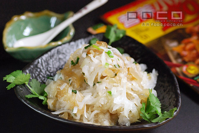 调料:植物油、糖、盐、葱、蘑菇精 做法:1、海蛰洗净后切丝后用凉开水浸泡开; 2、白萝卜洗净后刨丝用盐腌一会(约20分钟), 3、海蛰丝、萝卜丝分别沥干水分放在一起,放上糖、盐、蘑菇精、葱花放在最上面 4、植物油烧热后,直接浇在葱花上,然后搅拌均匀装盘即可。
