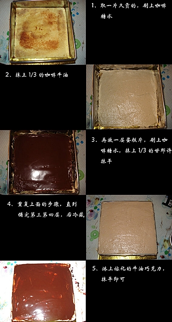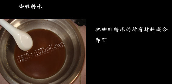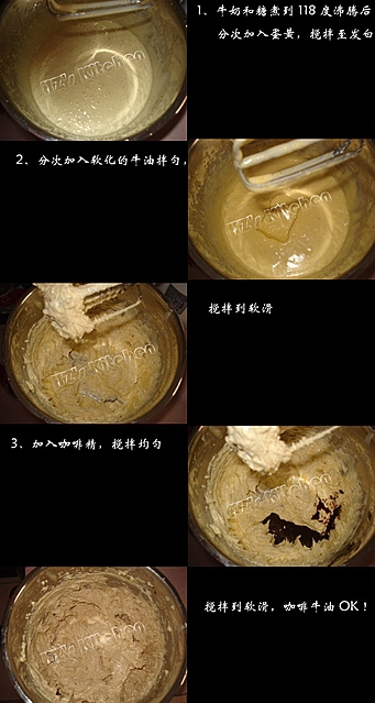 咖啡牛油馅的做法: ![]() 咖啡糖水的做法: ![]() 巧克力淋酱的做法: 牛油和巧克力混合,隔水加热熔化,搅拌均匀即可~忘记拍照片了:P 蛋糕体的组合: