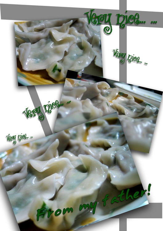 在这个行业,其实最不想的就是跟家人的见面和沟通太少了~~有一天突然很想吃爸爸包的饺子(因为我爸是山东人,所以做的饺子特棒)就打电话告诉他,原来这样一通电话可以让他这么高兴!晚上回到家里,原来他已经弄了两种馅了,连我妈都说他忙了一整天了~~~当然,包饺子这个任务放在我身上了,哈哈`~我对这个倒是很有自信,很有卖相的,终于,一顿开开心心的晚餐就这样结束了,但不能吃太多哦`~会变胖哦... ...