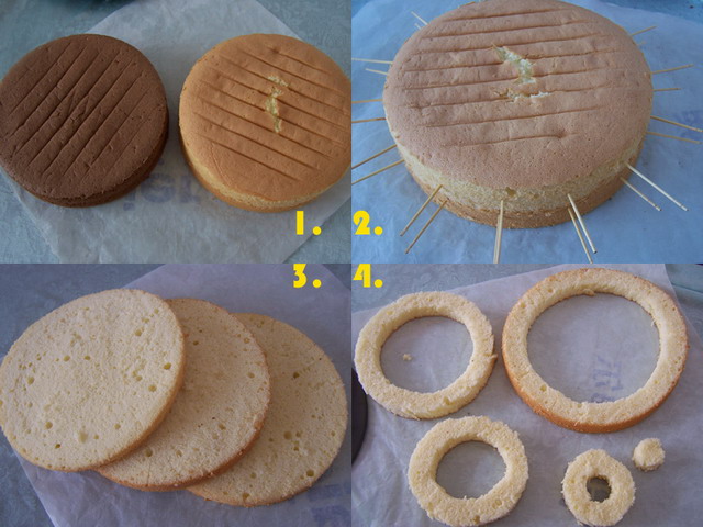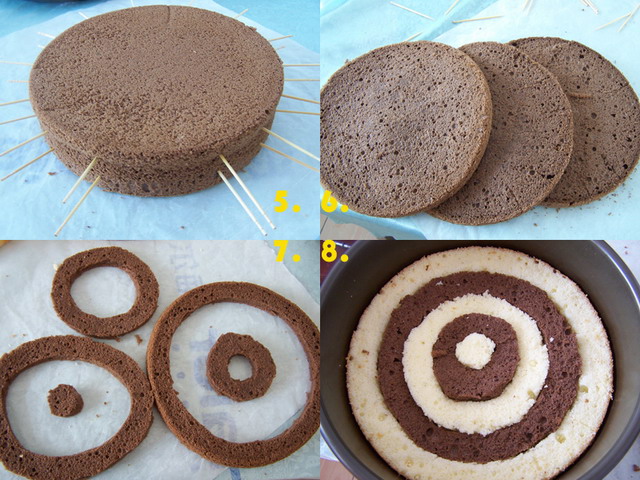 个蛋糕的做法我就不写了,以前做过的,拼图过程请看以下图片,最后每一格每一层一定要涂上打发的鲜奶油,表面自己装饰一下就可以了!