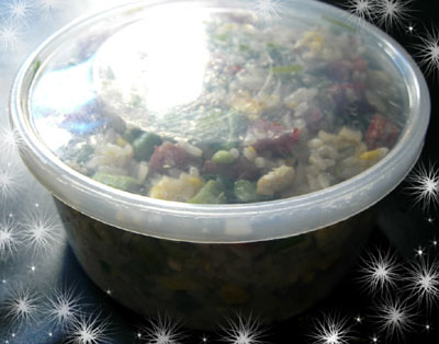 找了两个鸡蛋..同事老家带来的四川腊肠,昨晚剩下的豆角..弄一弄...哈哈~~不错不错~正想吃的时候,馆里来电,有事要赶回去.. 呜....惟有打包回去吃...刚装好盖上盖子..呀!忘记给我的炒饭也SHOW一张....结果,平塌塌的..照了几张..没劲..不拍了..上班去...