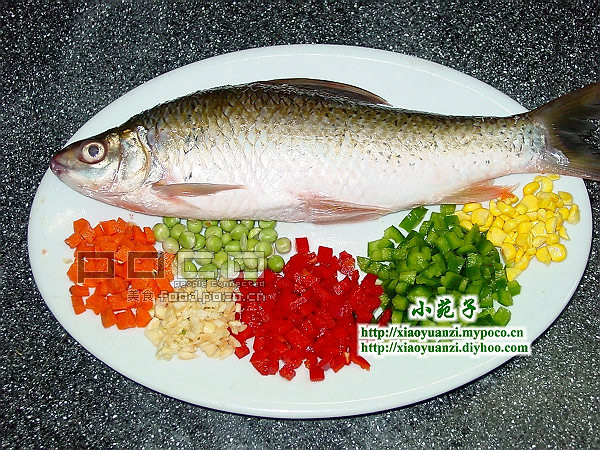 材料:鲜鱼、青红椒细丁、豌豆、红萝卜细丁、玉米粒、蒜末