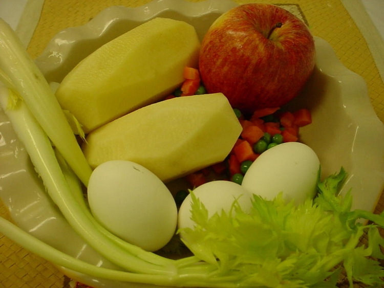 香烤三文鱼:做法~~用盐/胡椒粉/米酒/橄榄油/洋葱将切好的三文鱼喂好,入烤箱15分钟既好.土豆沙拉:材料~~~土豆(2)/鸡蛋/青豆/胡箩卜丁/脆苹果(1)/芹菜/洋葱.调料~~~美奶汁/橄榄油/盐/黑胡椒粉/糖/柠檬汁.做法:1/土豆切丁与青豆/胡箩卜丁一起滚水煮熟,用凉水过,备用.2/鸡蛋煮熟,用凉水过,剥皮切块待用.3/苹果/芹菜/洋葱洗净切丁.4/将所有备好的料入一大碗里,加入所有调味料拌匀.一般的土豆沙拉是不放苹果的,大家可尝试一下,有苹果的沙拉更加美味,香甜!