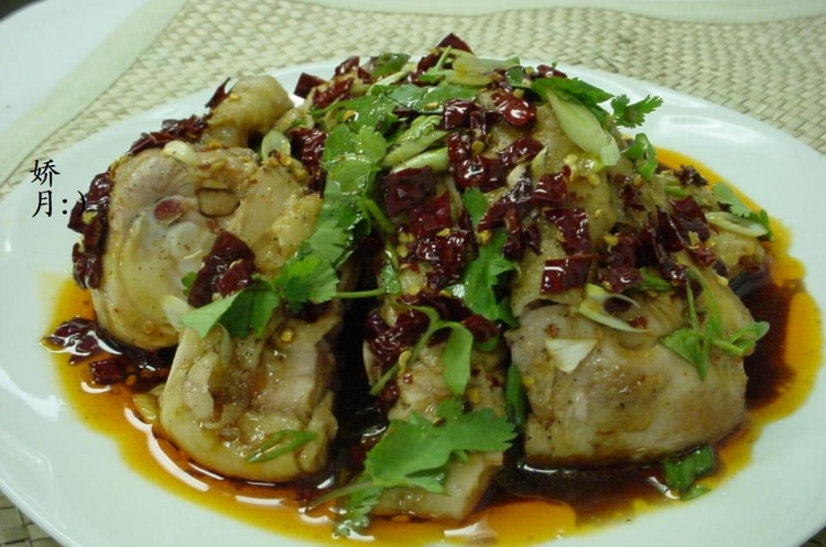 麻辣鸡:材料~~2个大鸡腿.调味料~~盐/黑胡椒粉/白胡椒粉/干椒红油/麻油/姜油/葱/香菜/花椒油.用一大碗调好口,备用.做法~~~鸡腿洗净,用开水汤一下,再加点盐/油/水闷煮30分钟,放凉后置于冰箱里冷藏,凉透后,改刀/装盘.将备好的汁浇在改刀的鸡块