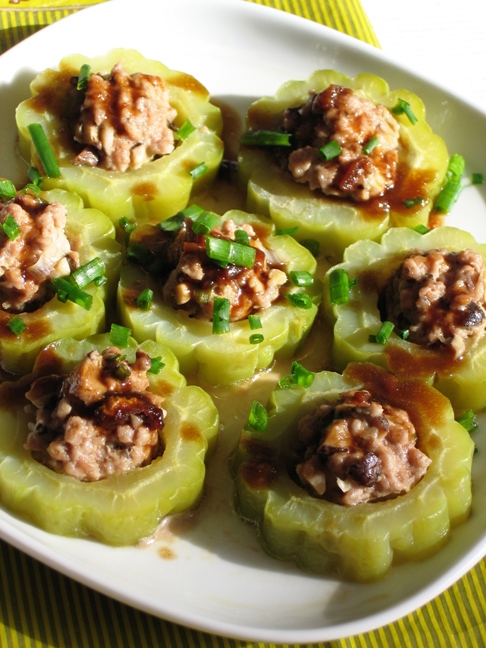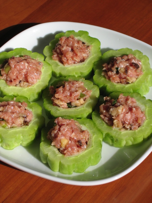 成品苦瓜镶肉: 做法: 1. 苦瓜切成段,将瓤取出。 2. 放入调好的肉糜(见1)蒸6分钟。 3. 蒸好后的汤汁重新倒入锅里,加酱油少许生粉搅匀。 4. 倒在菜的表面即可。