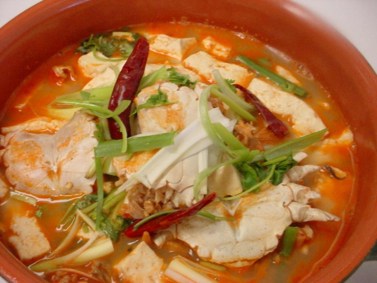 螃蟹豆腐煲:材料~~螃蟹/豆腐/葱/姜/蒜/料酒/少糖/韩国辣粉/香油/鸡汤/味素.做法~~将螃蟹洗净,豆腐切块,烧锅,葱/姜/蒜/爆锅,入螃蟹,加酒/糖/辣粉翻炒,蟹变红,入煲里,加豆腐,鸡汤,20分,出锅时加味素.也可放点香油.