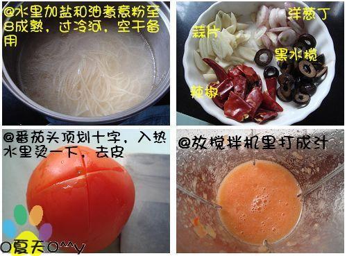 做法: 1)水烧开后加盐和橄榄油煮意粉,煮至8成熟(因为还要回锅收汁,不能太软),煮好后过2次冷水,控干水份备用~ 2)番茄头顶划十字,热水里煮一下,去掉皮后用搅拌机打碎备用~ 准备蒜片,洋葱丁,黑水榄(没有就不加了,纯粹是好看),辣椒 3)培根切丁减出油,倒掉大部分(能出好多油啊),爆香蒜和洋葱,辣椒,倒入番茄原汁,加盐,鸡精,糖,胡椒,一滴酱油调味(还可以加一片月桂叶),加入意粉收汁,出锅前加黑水榄即可~~