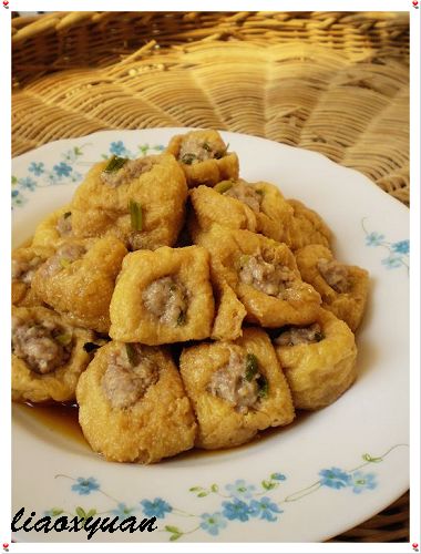 油豆腐塞肉,就是把油豆腐挖个洞,把肉泥塞进去,然后蒸,简单好吃。在温州的菜市场都有人边做边卖,问我同学,他们既然都说他们都没有这种吃法的,嘻嘻,大家试试看,很好吃,也很简单。妈妈做得最好吃了。做法:1,适量肉泥,小葱,将肉泥,葱,和少量料酒,盐,味精,麻油,拌匀2,将油豆腐挖个小洞,塞入拌好的肉泥3,放锅里蒸,再加点酱油,味精,酒,一