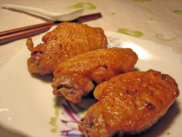 瓜4.jpg 香煎鸡中翅 材料:鸡中翅三个 步骤:1.洗干净鸡翅,用姜粉,高汤素,盐,香油和少许酒腌制约20分钟;2.起油锅,待油约6成热时,放鸡翅。3.两面煎至金黄。4.在上碟前,放一汤勺水下锅,微焖一下鸡翅。5.起锅