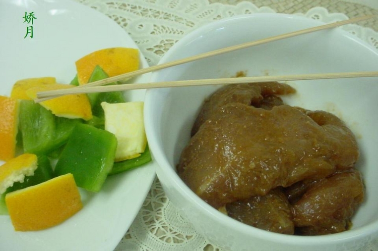 做法:1/鸡肉切小块,加入腌料腌20分钟,青椒切块备用. 2/将沙爹酱抹在腌好的鸡块,用竹签串起,入烤箱200C,15分即可. 蕃茄牛丁面:材料:蛋面/蕃茄/胡箩卜丁/牛肉馅/洋葱/姜末.调料:料酒/高汤/蒜/盐/糖/酱油.做法:1/蕃茄/胡箩卜/洋葱都切丁.2/面煮熟,净水备用.3/用洋葱/姜末爆香锅,入牛肉馅充分炒香,加蕃切/胡箩卜,入调料.一起炖煮20分. 4/浇到面上即可.