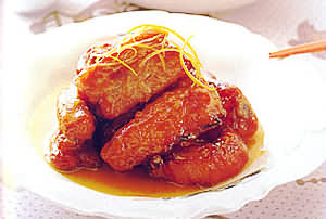 橙汁排骨材料:小排骨600克、柳橙(或脐橙)4个、生菜2片调味料:1.酱油1大匙、料酒1/2大匙、橙汁1/2杯(用2个脐橙榨汁取得或用浓